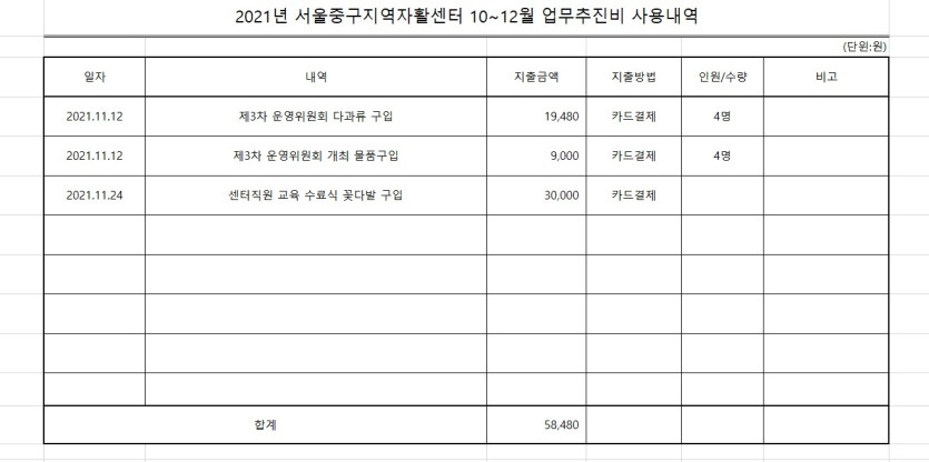 2021년 서울중구지역자활센터 10월~12월 업무추진비 사용내역 페이지 정보 작성자 서울중구지역자활센터 댓글 0건 조회 4,994회 작성일 21-12-16 18:48 목록 본문 . 이전글서울중구지역자활센터 2021년 결산공지 22.01.27 다음글2021년 서울중구지역자활센터 7월~9월 업무추진비 사용내역 21.12.16 댓글 0 댓글목록 등록된 댓글이 없습니다.