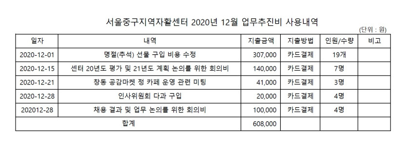 서울중구지역자활센터 2020년 12월 업무추진비 사용내역 페이지 정보 작성자 서울중구지역자활센터 댓글 0건 조회 5,024회 작성일 21-01-12 10:45 목록 본문 서울중구지역자활센터 2020년 12월 업무추진비 사용내역 이전글[합격자공고] 자활근로사업 자활전문가 합격자 공고 21.01.12 다음글서울중구지역자활센터 계약직 직원 채용 공고 21.01.11 댓글 0 댓글목록 등록된 댓글이 없습니다.